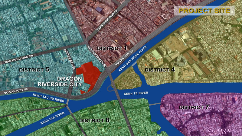 Vị trí dự án khu phức hợp căn hộ thương mại Dragon Riverside City nằm ngay số 628 – 630, mặt tiền đại lộ Võ Văn Kiệt, thuộc địa bàn của quận 5.