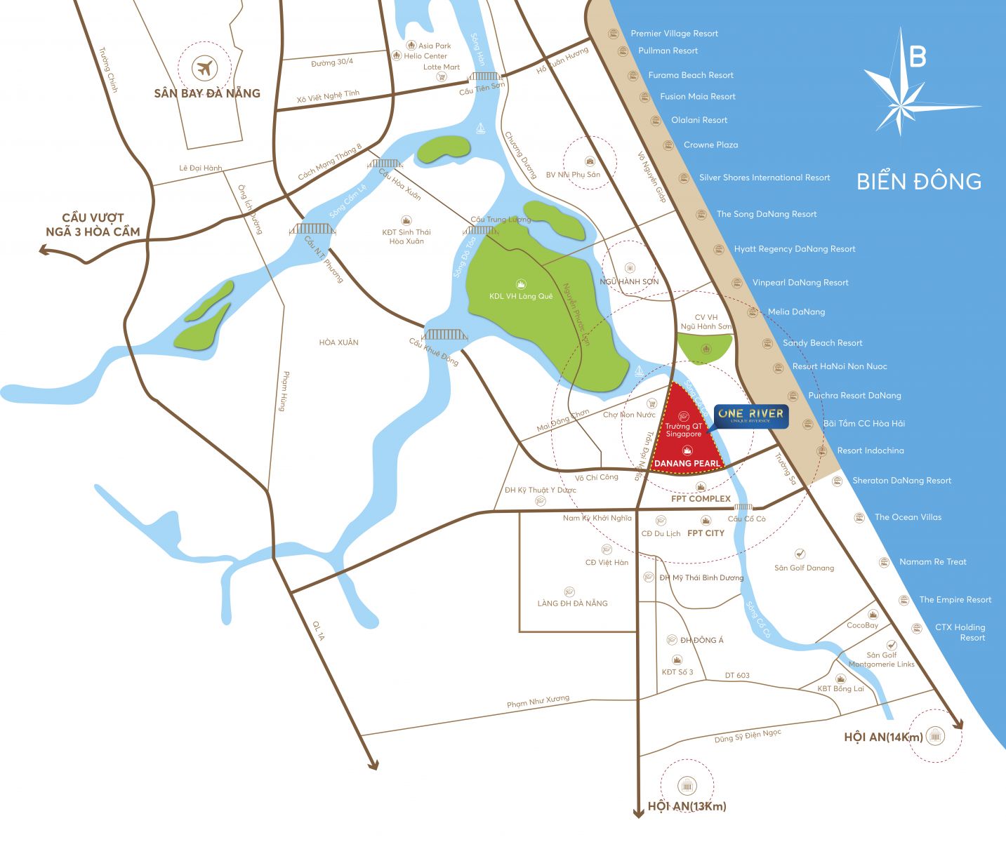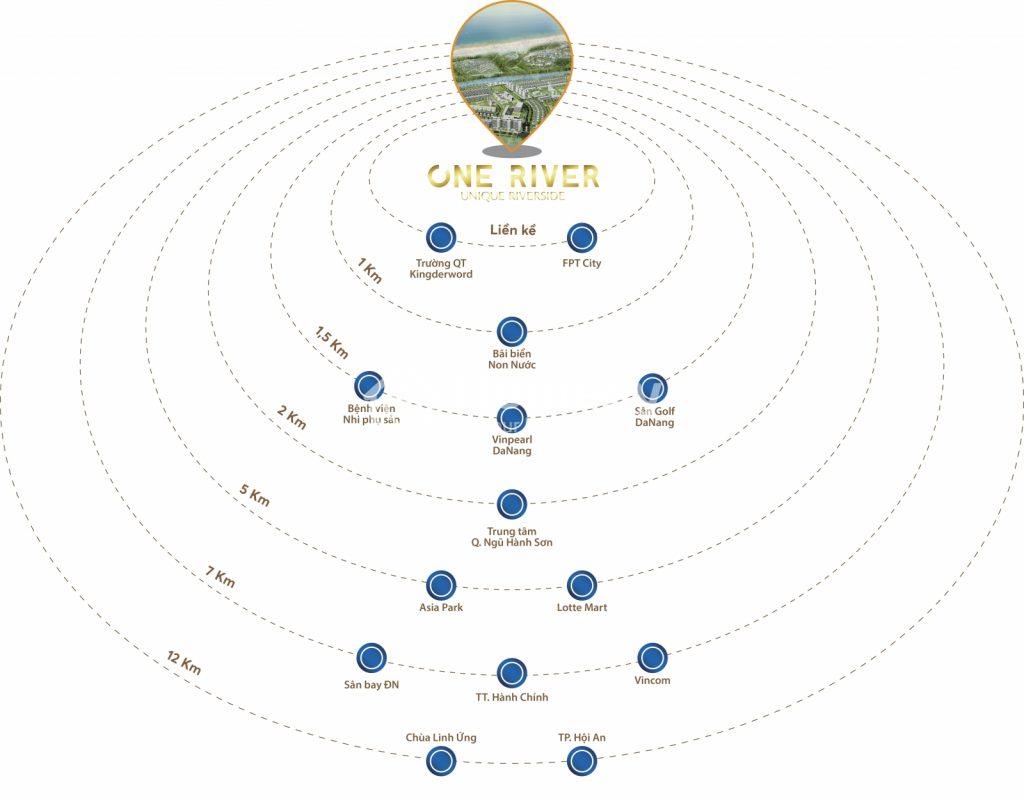 Vị trí “huyết mạch” – Tựa sơn nghinh thủy tại mặt tiền đường chính Trần Đại Nghĩa – con đường giao thương nối liền 2 thành phố du lịch trọng điểm đi Đà Nẵng và Hội An. Dự án One River tọa lạc tại địa điểm vàng trên con đường Lê Văn Hiến kết nối với khu phố cổ Hội An, nằm ngay bên cạnh núi Ngũ Hành Sơn nổi tiếng thì khu đô thị này còn sở hữu hơn 2,1km mặt tiền sông Cổ Cò thơ mộng. Thừa hưởng nhiều lợi thế từ thiên nhiên và là vị trí trọng điểm du lịch.