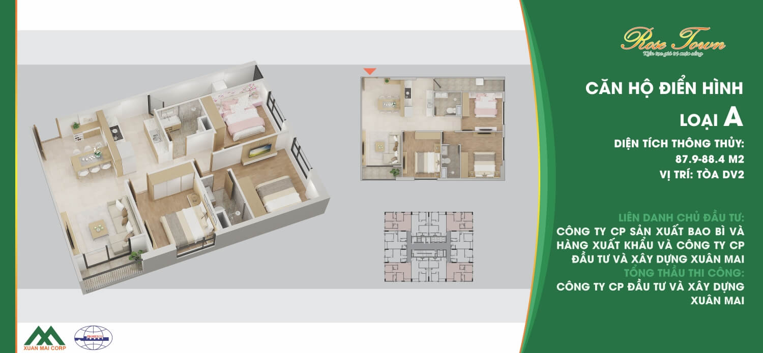 - Diện tích trung bình: 57m2 đến 88m2 (2 – 3 Phòng ngủ)