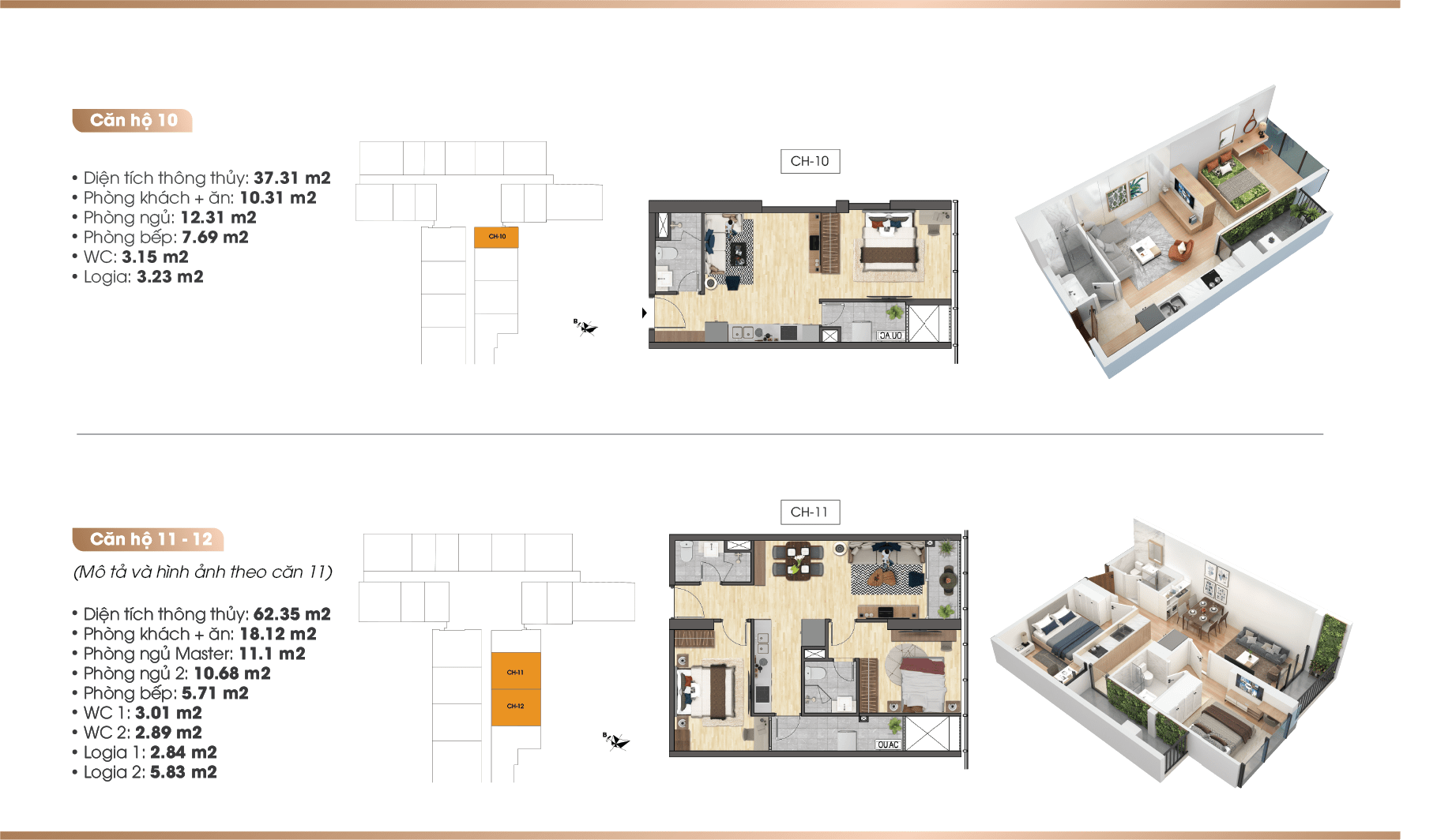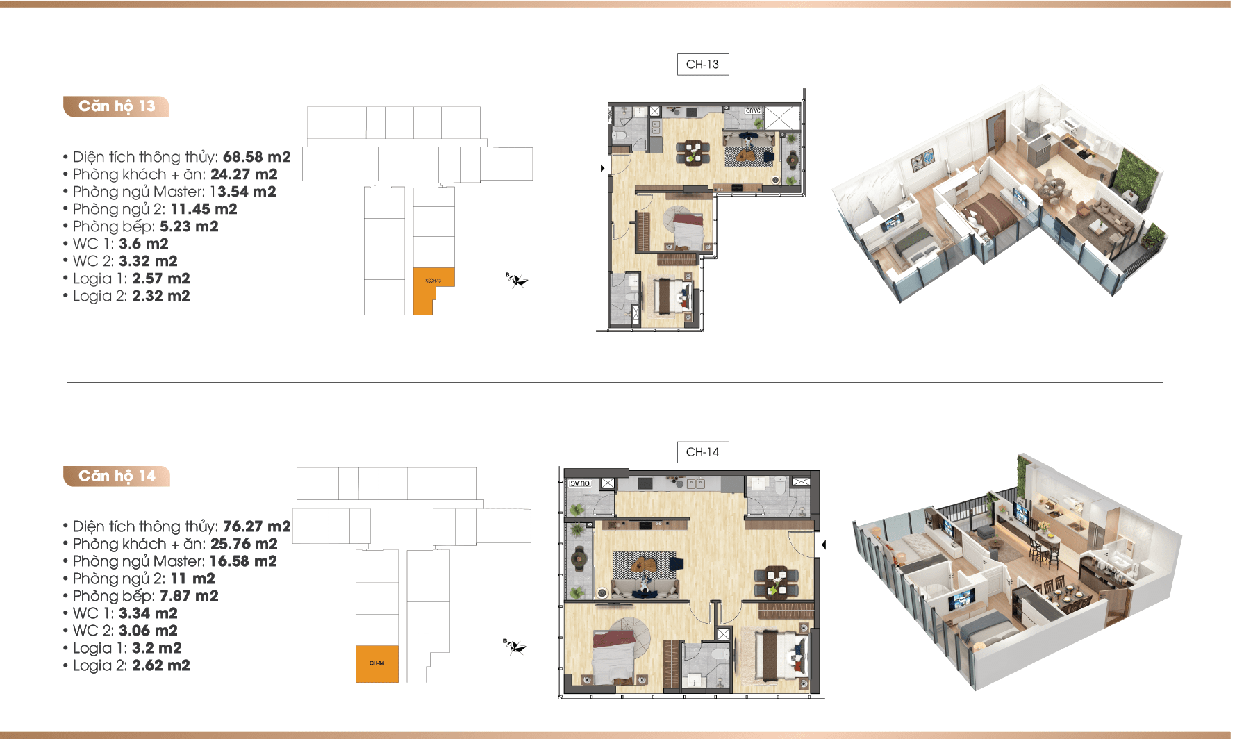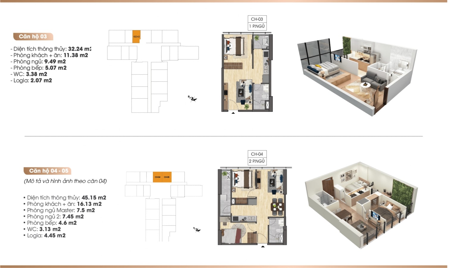 – Căn 2 phòng ngủ có diện tích:45,15 – 76,27 m2