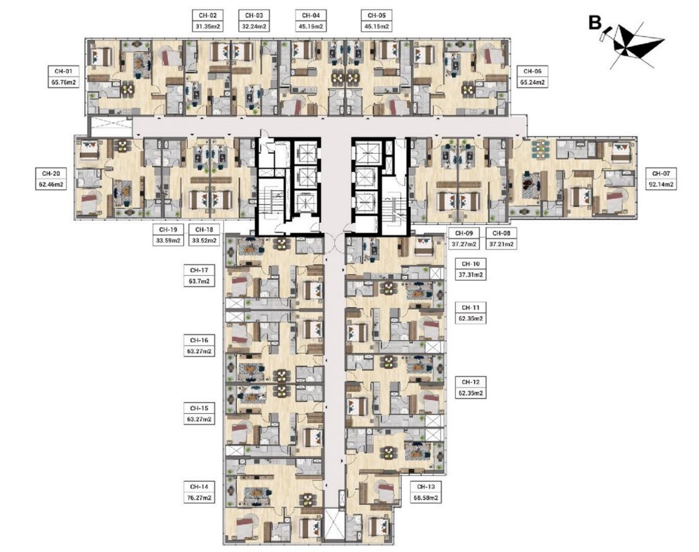 Mặt bằng tầng dự kiến TNR The Nosta bao gồm 20 căn hộ khách sạn một tầng với diện tích đa dạng từ 31,35 – 92,14 m2 trong đó: