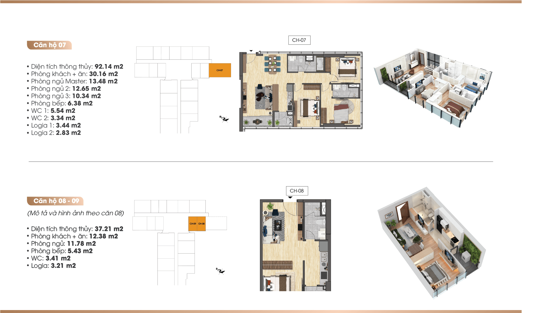 – Căn 3 phòng ngủ có diện tích: 92,14 m2