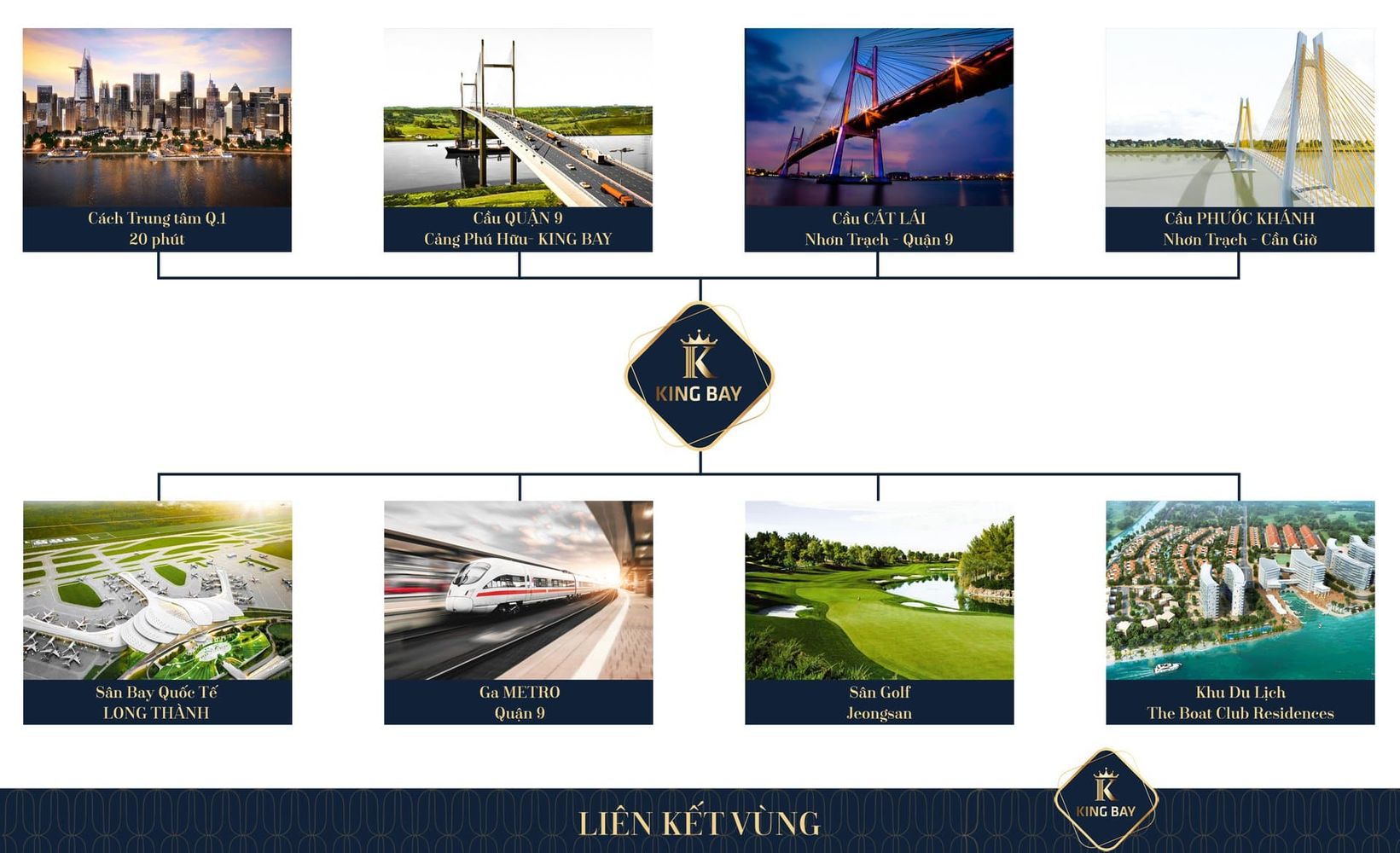 Tọa lạc tại vị trí cửa ngõ phía Đông Sài Gòn, khu đô thị sinh thái phức hợp King Bay dễ dàng kết nối tới trung tâm Quận 1, trung tâm Thủ Thiêm và các đô thị vệ tinh nhờ hệ thống giao thông hoàn thiện và đang được đầu tư đồng bộ: Đường Vành đai 3, Đường 319, Cầu Quận 9, cầu Cát Lái; Quốc lộ 51 nối Quốc lộ 1A với TP. Vũng Tàu; Cao tốc Long Thành – Dầu Giây; Cao tốc Bến Lức – Long Thành kết nối Sân bay Quốc tế Long Thành trong tương lai.