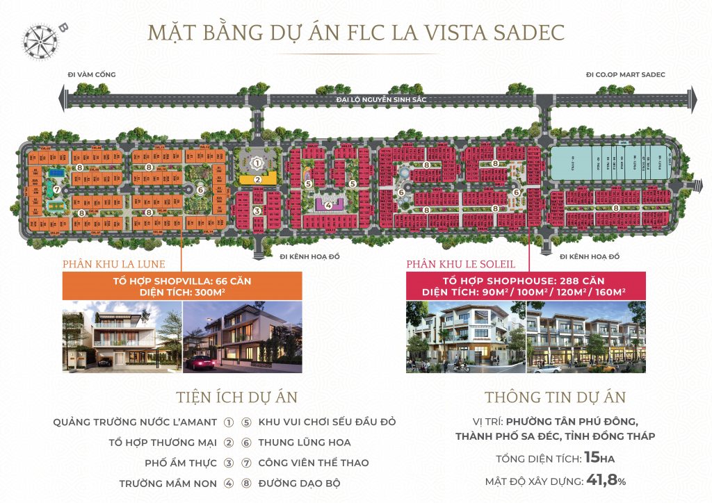 FLC La Vista Sadec được quy hoạch trên tổng diện tích đất 15 ha; mật độ xây dựng 41,8%. Dự án gồm hai phân khu chức năng với các khu nhà phố thương mại (shophouse) và tổ hợp shopvilla.
