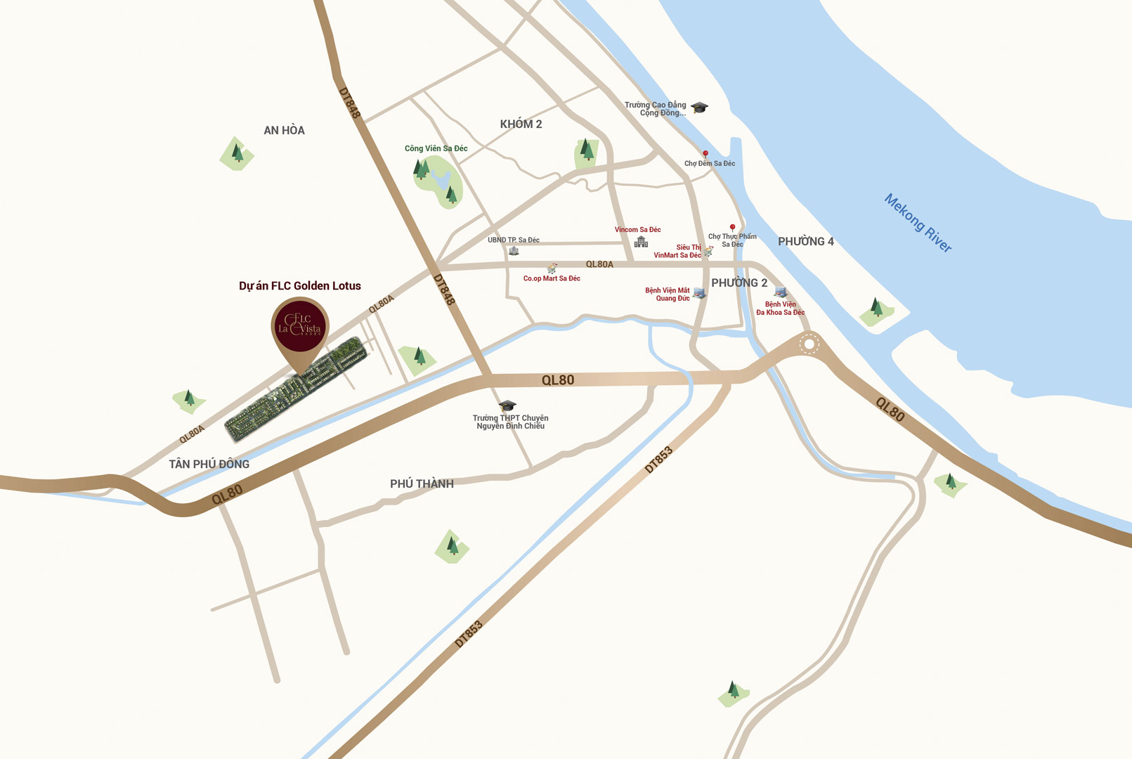 Dự án khu đô thị FLC La Vista Sadec sở hữu địa thế vô cùng đắt giá, tọa lạc tại xã Tân Phú Đông, TP Sa Đéc, tỉnh Đồng Tháp. Đây là một tổ hợp đô thị hiện đại, đồng bộ và giàu bản sắc, đón đầu những xu hướng sống mới đang dần hình thành tại Đồng Tháp.