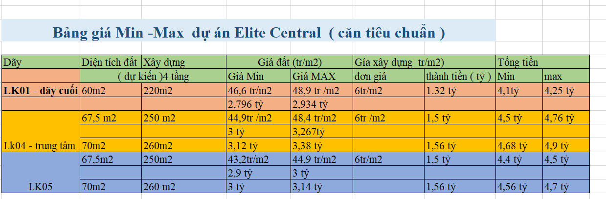 Diện tích liền kề : 60 – 70 – 80 – 120m2