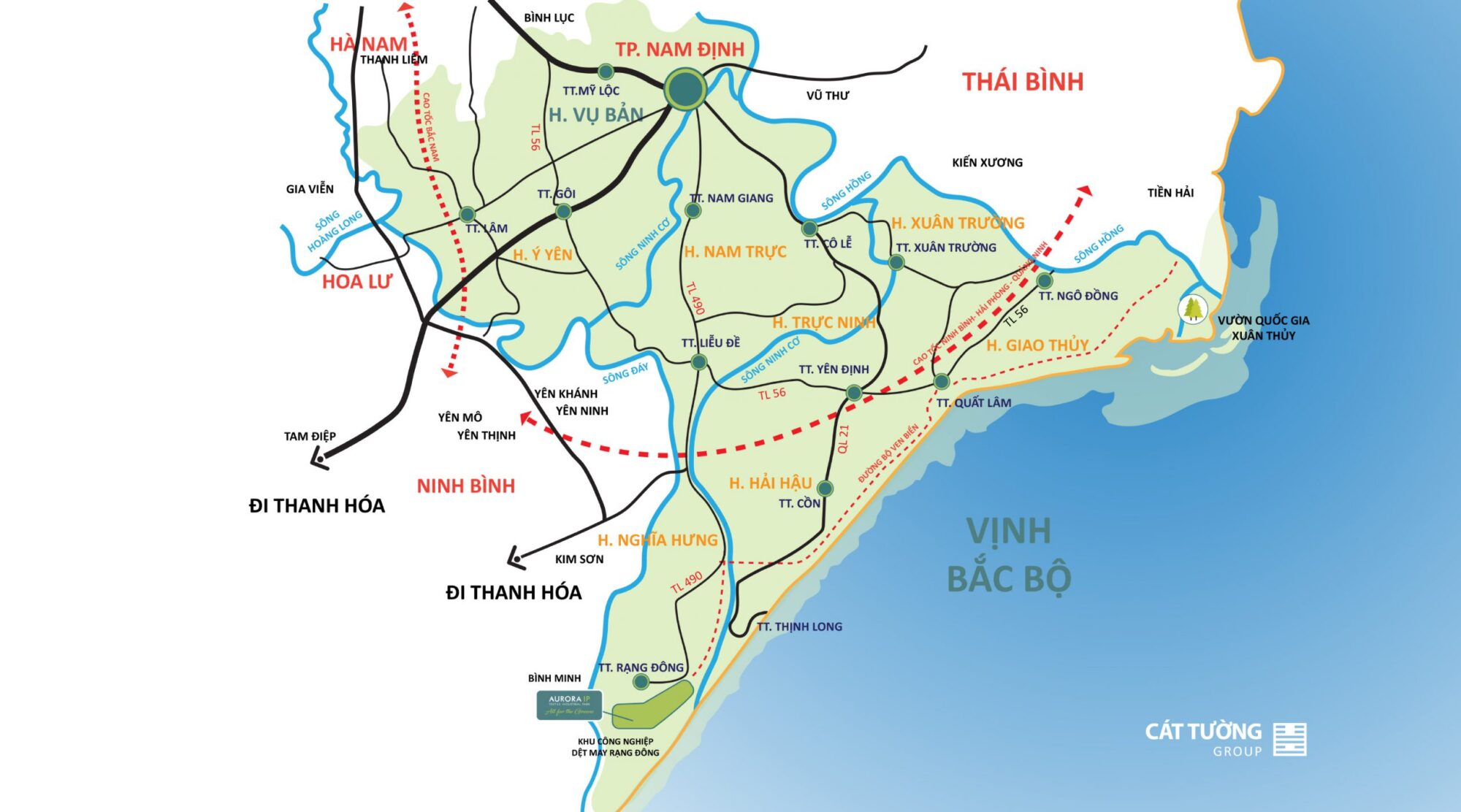 – Nằm trong Khu kinh tế Ninh Cơ (với tổng diện tích 14.000ha gồm sân bay, cảng biển, nhà máy điện). Nền tảng cho việc thu hút đầu tư tại Aurora IP chính là hệ thống kết nối đường thủy với Cảng Hải Thịnh (10km); Cảng Hải Phòng (140km), Cảng biển nước sâu Cái Lân (200km); hệ thống kết nối đường bộ 50km đến trung tâm Thành Phố Nam Định, 130km đến trung tâm Thành Phố Hà Nội; 40km đến trung tâm Thành Phố Ninh Bình; 75km đến trung tâm Thành Phố Thái Bình, 150km đến sân bay Nội Bài – Hà Nội; 145km đến sân bay Cát Bi – Hải Phòng.
