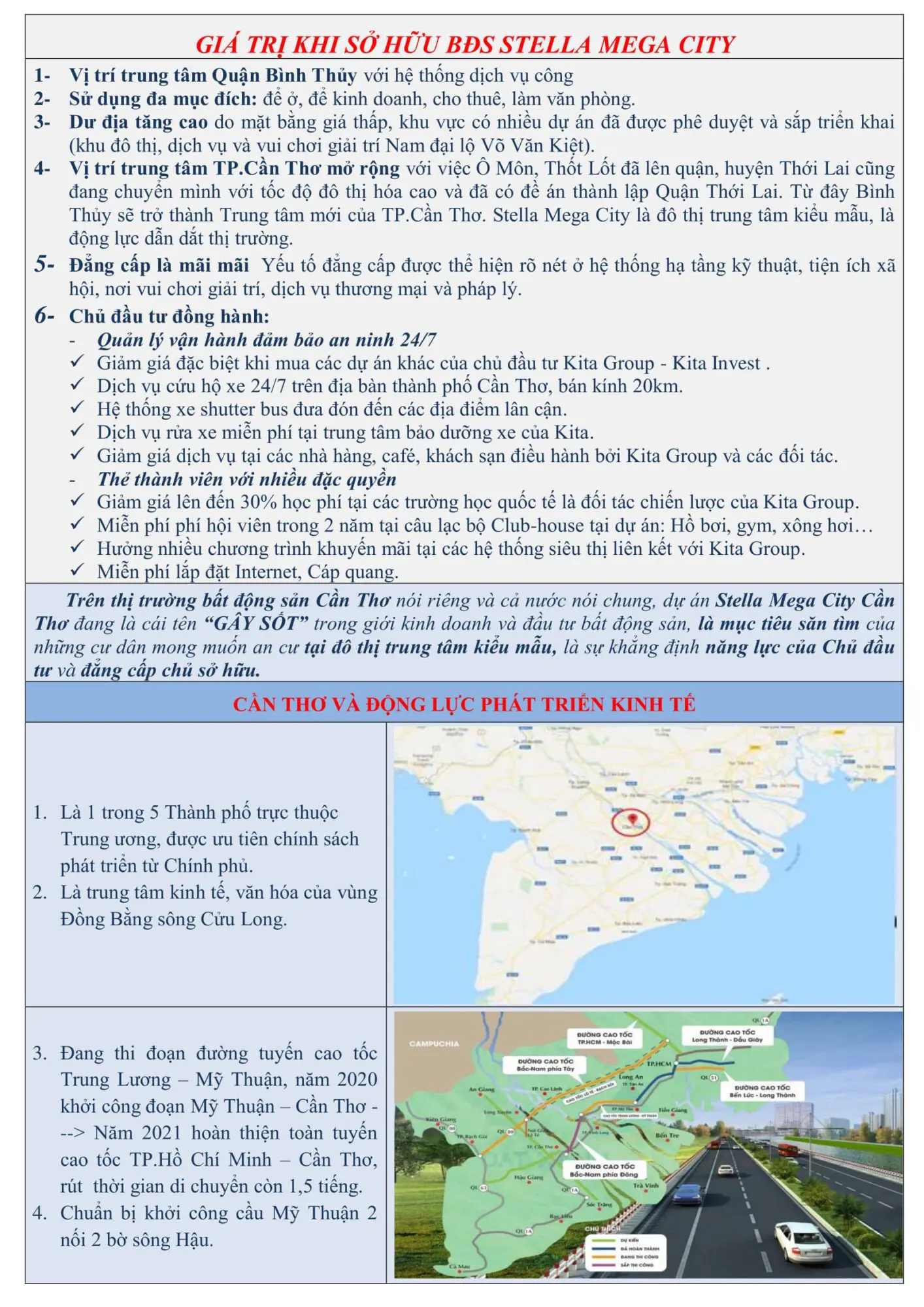 Đặc biệt theo định hướng quy hoạch đến năm 2025, Tp.Cần Thơ sẽ trở thành trung tâm công nghiệp, thương mại – dịch vụ, giáo dục – đào tạo, khoa học – công nghệ, y tế và văn hóa của toàn vùng, đồng thời là đô thị cửa ngõ của hạ lưu sông Mêkông, là đầu mối giao thông nội vùng và quốc tế quan trọng, có vị trí chiến lược về quốc phòng, an ninh. Bên cạnh đó, với dân số gần 2 triệu người cùng những lợi thế phát triển nổi trội, chắc chắn nhu cầu về bất động sản của Tp.Cần Thơ là rất lớn, do đó những dự án chất lượng, pháp lý hoàn chỉnh như đất nền KĐT Stella Mega City sẽ là điểm đến an cư lý tưởng, cơ hội đầu tư an toàn cho khách hàng và các nhà kinh doanh.