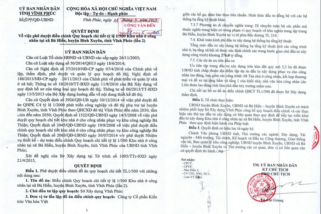 Quyết định số 1204/QD-UBND tỉnh về việc điều chỉnh phê duyệt chi tiết tye lệ 1/500 dự án khu nhà ở công nhân tại xã Bá Hiến, Huyện Bình Xuyên, Vĩnh Phúc lần 2. Xét duyệ của sở xây dựng tại tờ trình 1905 TTr/SXD ngày 21/04/2015. Nội dụng chi tiết.