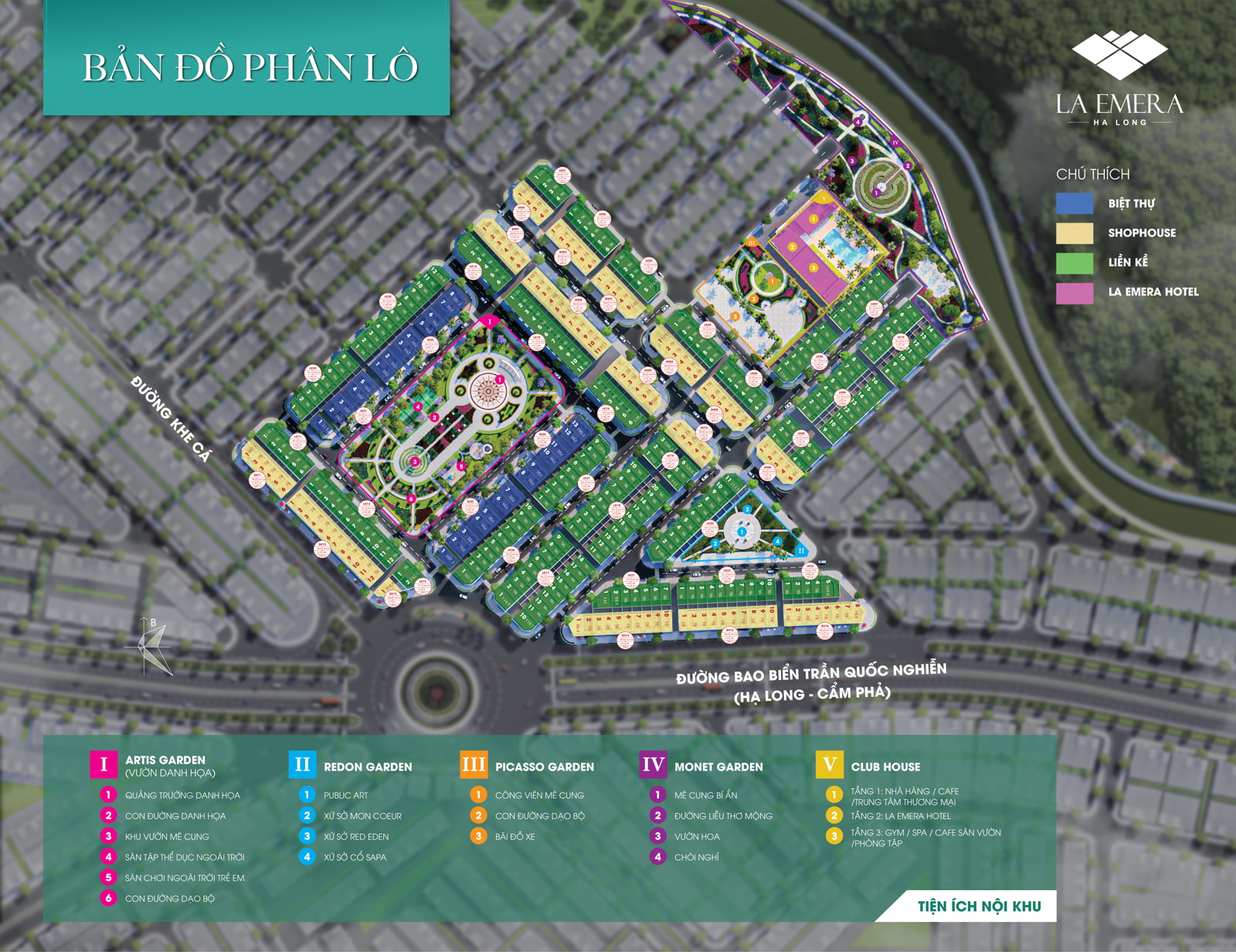 Dự án La Emera Hạ Long kiến tạo một cuộc sống an cư phồn thịnh cho cư dân tương lai qua việc trang bị các tiện ích nội khu – ngoại khu đồng bộ hoàn hảo, giúp cư dân an tâm tận hưởng cuộc sống lý tưởng với đầy đủ tiện nghi ngay chính tại nơi mình ở. Toàn bộ không gian của khu đô thị tập trung xung quanh không gian mở trung tâm là khu công viên, hồ nước, công trình cao tầng và biệt thự, tạo thành lõi không gian có mật độ xây dựng thấp. Vành ngoài là các công trình nhà ở dạng liền kề với mật độ xây dựng cao.