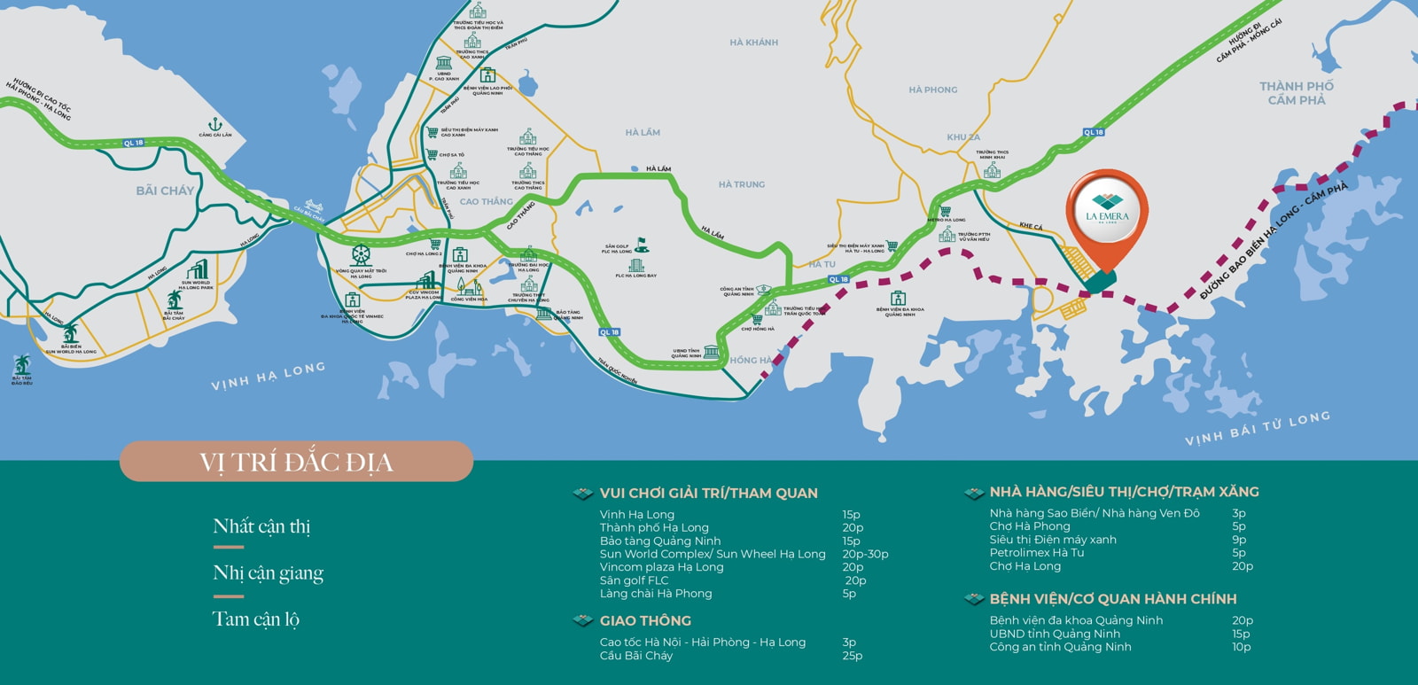Dự án La Emera tại Hạ Long cách cao tốc Hà Nội – Hải Phòng – Hạ Long – Vân Đồn chỉ 1km, cách trung tâm TP Hạ Long 6,5km… có thể nói dự án rất thuận tiện về giao thông và dễ dàng di chuyển đến các địa điểm nổi tiếng tại Hạ Long. Dự án cách cầu Bãi Cháy 7,3 km và Trung Tâm thành phố Hạ Long 6,1km
