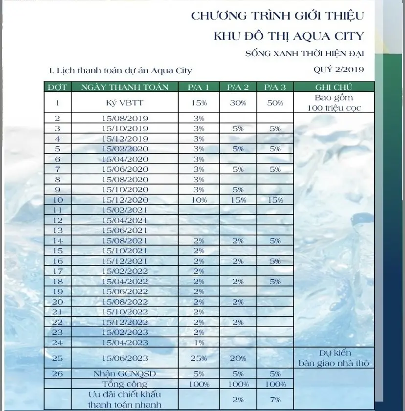 Phương thức thanh toán Aqua City Biên Hòa – Áp dụng quý 2/2019