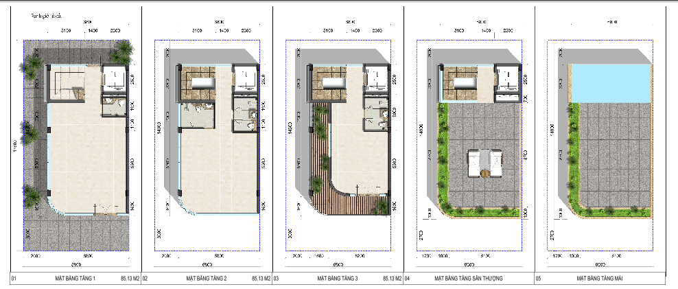 - Diện tích mặt sàn: 257,91m2 (diện tích xd: 85,97m2)